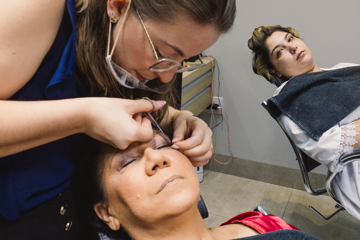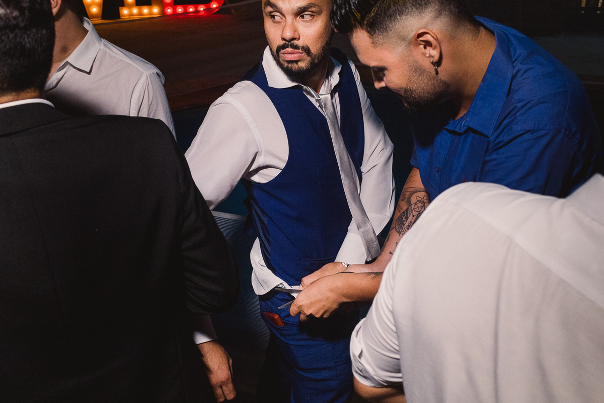 No dia, os dois ficaram prontos em lugares separados. O Matheus curtiu com os padrinhos no barbeiro, enquanto a Aline arrasava no salão com as madrinhas.